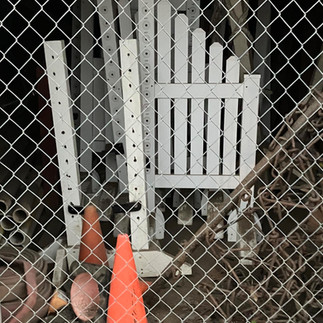 The storage area holds jumps and other accessories used for the Saddle Club horse shows. The chain link looks unprofessional. The holes allow mice and their friends to crawl through and find a warm home. Mice are often followed by snakes and it would be unfortunate for someone to find a snake when pulling out the equipment. A solid door would work better, for looks and for safety.